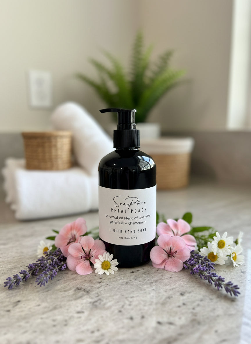 Wrap your skin in serenity with Petal Peace, a calming blend of nature’s most soothing botanicals. This gentle liquid soap combines pure Castile soap and distilled water with a tranquil trio of lavender, geranium, and chamomile essential oils — creating a soft floral cleanse that comforts both skin and spirit.
